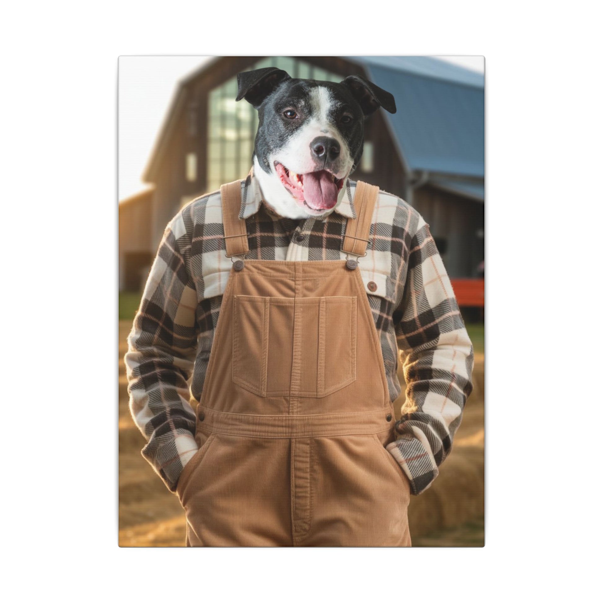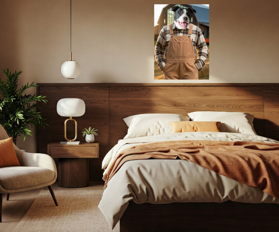 Meet your pet, the newest farmer on the block! Against a softly blurred farm backdrop with tractors and hay bales, they radiate charm, humor, and a sense of adventure. The detailed portrait captures every aspect of their personality, making them the centerpiece of your décor. A playful and heartfelt tribute to your furry friend’s spirit.